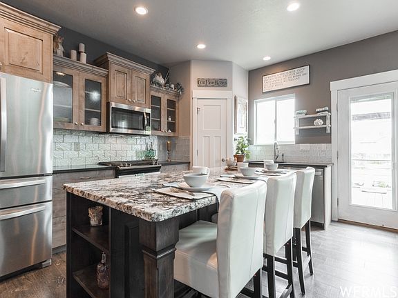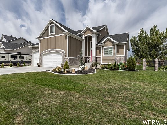 Imagine ease of living with all the conveniences of town with a taste of the country in one place! Enter to see the soaring ceilings of the great room, shaker trim throughout, elegant gas fireplace surround. Open concept designer kitchen, with stainless appliances, including super-quiet LG dishwasher, the large granite island, low profile gas stove, and fridge with French doors and produce drawer. Soft-close cabinets, easy work-triangle, pantry, and elegant backsplash, makes this kitchen a delight to cook in. With the master on the main and separate laundry room adjacent, this makes one-level living easy. Upgraded carpet in most spaces make family life no-worry. The open staircase leads to the second floor featuring an additional 3 bedrooms with large closets and full bath! The welcoming master boasts a luxurious bathroom. Picture soaking the jacuzzi tub, enjoying the walk-in shower, with the hand-held shower head that makes bathing the dog easy! Double sinks with granite counter tops and private toilet space. Pass through to the bright, spacious, and elegant walk-in closet with a make-up area. The basement features a large family room with distressed board ceilings, workout room, music room, office space, built-in book shelves, a 5th bedroom and is plumbed for another bathroom. Who would want to have all the expense and hassle of putting in new expensive sod, sprinklers, and fencing when you can have it already done? Step into the backyard on the brand new bi-level, large trex deck! Take advantage of the beautiful views of Ben Lomond while you watch the kids play, gaze at the easy-maintenance elevated perennial garden (all with deluxe weed barrier and automated sprinklers!) Fruit trees, roses, and grand rocks are encased in concrete borders. This is a great spot to have dinner outside with friends, or sit and watch the stars! Don't forget to check out the garden/chicken shed (she-shed?) with covered deck, ceiling fan, barn door, electric and water! The home also boasts a 4 car garage, able to shelter all the toys or room for workshop. This home offers everything a modern, busy family needs, as well as conveniences to make your busy life easier!