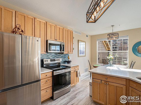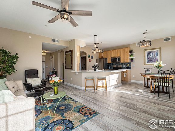 This first-floor condo boasting an abundance of natural light invites you into a haven of comfort and style. Upon entering you'll see direct mountain views that include Longs Peak. Conveniently located near the clubhouse, pool, gym, and mailbox this home promises a lifestyle of ease, even the monthly water is in included in the HOA! Step inside to discover new LVP floorings, seamlessly connecting each room with a touch of timeless elegance. The completely renovated kitchen is a culinary masterpiece, featuring lowered, larger quartz countertops that provide ample space for meal preparation - a unique upgrade for this community. Equipped with new stainless steel appliances, a filtered water dispenser, and contemporary light fixtures, this kitchen is both functional and aesthetically pleasing. Both ensuite bathrooms have undergone a stunning transformation, reflecting modern sophistication. Every detail has been carefully curated, from the fixtures to the tiles, offering a rejuvenating experience within the comfort of your own home. With meticulous attention to detail, the renovations ensure a seamless blend of luxury and functionality. Beyond the interior, step outside to a private balcony where you can savor moments of tranquility or entertain guests in style. Enjoy the convenience of being on the first floor, with an attached garage offering easy access to the surrounding amenities and a sense of connectedness to the vibrant community. Whether you're an avid golfer, fitness enthusiast, or someone who appreciates a well-appointed home, this property is a rare find.