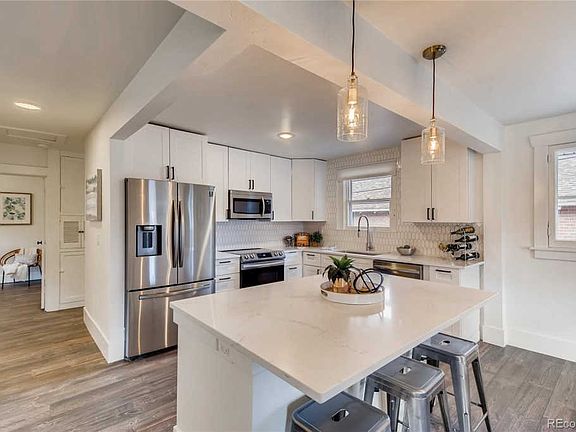 Completely remodeled 3 bed/2 bath Denver brick bungalow located in Sunnyside. This home is a must see with it's open light and bright floor plan, all new kitchen with white shaker cabinets, quartz countertops, island, stainless steel appliance, spacious bath with double sink and dual headed shower, trowel finish wall texture throughout, new laminate wide plank flooring upstairs, new carpet downstairs, new furnace, new hot water heater, 2 car detached garage, additional off street spot next to garage, updated electrical panel, newer roof, sewer line replaced in 2014, south facing lot, covered front porch, zoned C-1 allowing for future development of an ADU, blocks from great dining, and much more! This house does not disappoint!