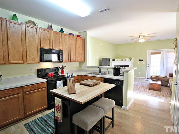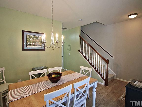 Bright & cheery END UNIT town home. New laminate floors throughout 1st floor & in both bedrooms. Each bedroom has attached private bath & WIC. Master has vaulted ceiling. Bath has dual sink vanity. Amazing location! Minutes to RTP, RDU, UNC & Duke. Very low HOA dues. Move in ready. Modern Security system w/whole-house monitoring, smoke detector & indoor camera w/motion sensor; 4 exterior cameras installed w/recording & hard drive. Refrigerator, TV in master, storage cabinet on deck convey.