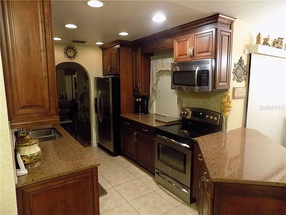 Fully updated pool home with split floor plan. Updates every where, you can move right in. The yard is beautifully landscaped with an array of tropical fruit trees and landscape brick borders all around. All the floors are tastefully updated starting with a beautiful medallion design as you enter. The living room and dining rooms are laminated as well as the bedrooms. The kitchen is fully updated with wood cabinet quartz counter tops and stainless appliances. Master bedroom updated with laminate flooring and crown molding. Master bath is updated with jetted tub and walk in shower. Large ceramic tiles as well. Dining room has beautiful chandalier . Florida room is also updated with large ceramic tiles and fan. All other bedrooms are updated with flooring also. Lanai is updated with new fans and brick pavers matching the pool. Separate laundry room with cabinets and tub. Pool has updated bull nose corners and marcite floor and brick pavers all around. A paved patio is outside pool, suitable for BBQ grill Several mature fruit trees and lots of space for privacy.