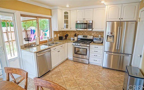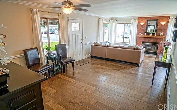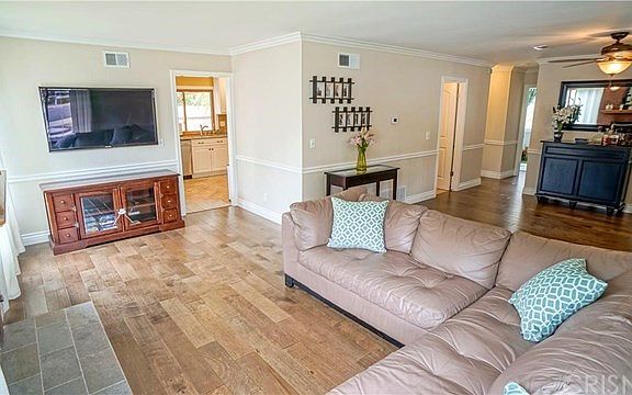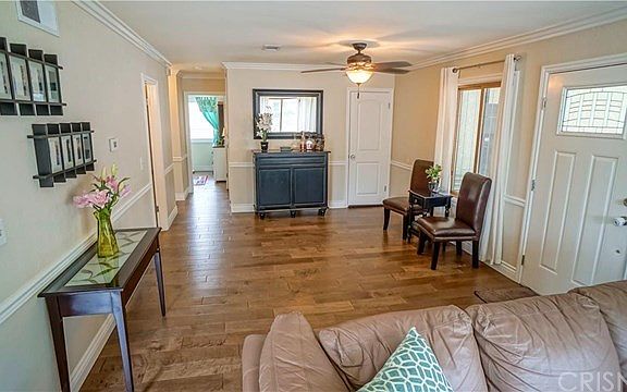 Charming move-in ready single story home, with RV access, in one of the best neighborhoods in Santa Clarita. This tastefully upgraded home is bright and has an open floor plan. New engineered hardwood floors in living room, kitchen, hallway and all bedrooms. Remodeled kitchen with new cabinets, granite countertops, travertine backsplash, stainless steel appliances and sink. New crown molding and baseboards throughout the house. Inviting brick fireplace in living room, dining off kitchen and large sliding glass doors that looks out to a large and private back yard with raised wooden deck. Garage door is less than 1 year old with remote control access. This home is full of character and has been tastefully upgraded. Don't miss the opportunity to own an upgraded single story home in this great neighborhood. Home is conveniently located near restaurants, shopping, great schools, and Central Park.