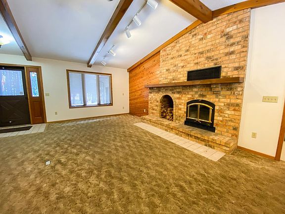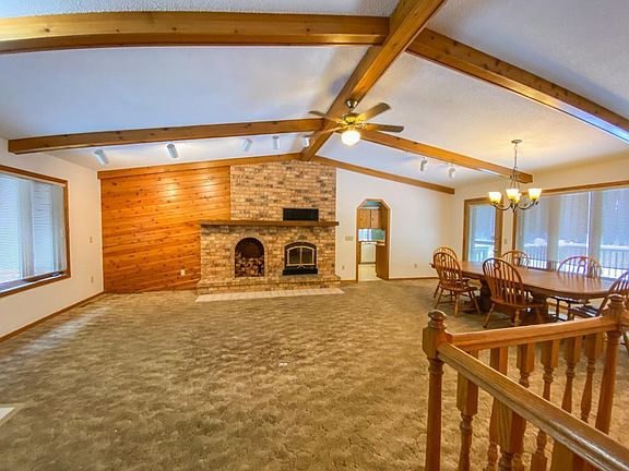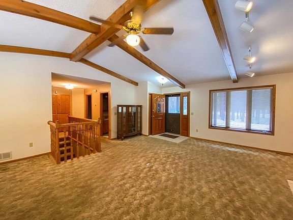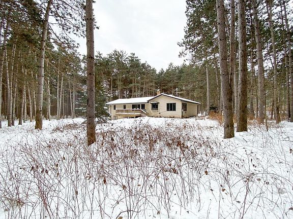 Great home tucked in the pine trees on 5 acres w/outbuilding for additional storage. This is a beautiful setting close to town. Open LR w/vaulted beamed ceiling, wood FP w/brick surround, master suite w/ 3/4 bath, lower level finished w FR, BR & 3/4 bath. Endless storage, stairs from garage to lower level.