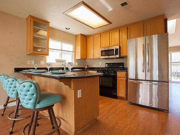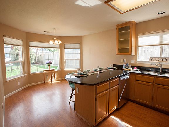 Delightful well kept home in a cul-de-sac, great location and close to schools. Family room has vaulted ceiling , skylights,pellet stove, laminate floors with a sliding door out to the patio. Kitchen has bealiutiful custom granite counter tops and a large bay window for dining. All bedrooms have NEW carpeting. Master has two large closets and a sliding door out to patio. This cozy home is a must see!