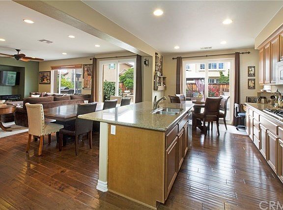 Sunshine, blue skies & wine tasting at Temecula Valley's finest wineries; can it get better? ABSOLUTELY! come home to your private, end lot & enter your open family room, complete w/ custom neutral paint, wood floors, & plantation shutters throughout, you turn on your fireplace and your ceiling fan, dim the lights as you head to the ent. system to rev up your favorite smooth jazz. As you prepare your guests for their stay on the main floor, in the oversized guestroom w/ walk in closet and 3/4 bath w/walk in shower, tile flooring and maple cabinetry throughout, you realize that dinner preparations must commence! Oversize granite island w/ Bosch dishwasher, stainless steel, abundant cabinet space & pantry that integrates seamlessly into the dining and family room, make for a delightful setting to prepare the most tasteful 5 course entree. Post dinner, you head out to the backyard complete w/built in barbecue and sit for while under your elegant canopy gazebo w/ rattan wicker seating for 6 or more of your 'besties' & take in the breeze while roasting a few marshmellows amidst the cozy firepit. As eve comes to close, you head up to your master ensuite w/small kitchenette for those 'midnite cravings', open with plenty of closet space, it's accompanied by 2 add'l oversized bedrooms w/ a full bath & double sinks. All of this & more nestled in fabulous Harveston w/ a 17 acre lake, pool, spa, 19 acre sports park, walking/biking trails and parks. Yes, welcome home, it just got BETTER!