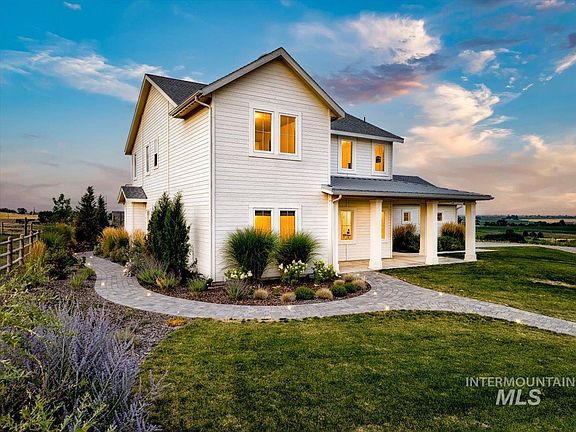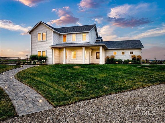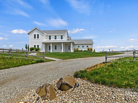 Discover rural elegance in this beautifully designed 4-bed, 3-bath home. High-quality finishes are showcased throughout, from the spacious living room with a cozy fireplace to the modern kitchen equipped with stainless steel appliances, custom cabinetry, a walk-in pantry & a farmhouse sink. The master suite is a luxurious sanctuary, featuring an expansive walk-in closet & a spa-like en-suite bathroom with premium fixtures & a fully tiled shower. Each additional bedroom offers generous closet space & unique charm. Step outside to a beautifully landscaped backyard, complete with an in-ground pool, cozy fire pit, & a dedicated trampoline area. The property also boasts a garden space, perfect for growing your own vegetables & flowers. The extensive open space provides endless opportunities for outdoor activities & enjoying the serene countryside. Additonal utilites have been ran & plans drawn for a guest house or you could add a custom shop. Don’t miss your chance to own this unique slice of Idaho paradise.