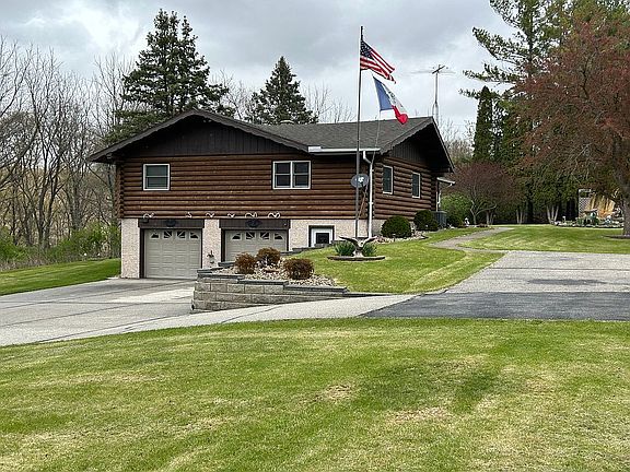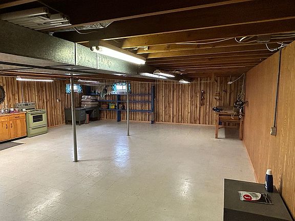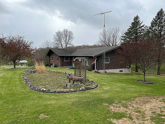 Are you looking for an acreage with the bonus of being on a hard surface road? This true log home consists of two bedrooms, one bath, an office, first floor laundry, and an open living, dining and kitchen area. The open floor plan of the dining and living room area have vaulted ceilings exposing the true logs of the home. Bedrooms, laundry and entry way areas have large closets with the master bedroom having a walk in. New floors in the kitchen and bath in 2022, along with new furnace and A/C in 2019, well in 2017, and includes appliances. The basement hosts the two-car garage with the remaining half having finished floors and walls with an additional stove, sink, and counter area. There is a separate 32x26 shed with cement floor along with a walk-in smoke house, blacktop drive, and garden area. The 3.2 acres consists of several walnut trees along with a valley view below.