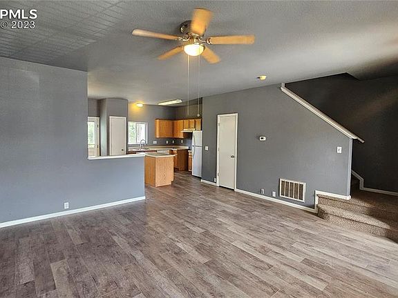 Move in ready, townhome located adjacent to the park in The Bluffs at Spring Creek. This charming 2-story unit offers the perfect blend of comfor. It has new carpet, new paint and new flooring. It also has A/C for those hot summer days. The lower level has a large living room, 1/2 bath, kitchen with island and dinning area. The upper level has vaulted ceilings in the primary bedroom and full bathroom attached. There is also a 2nd large bedroom with full bathroom attached and laundry area. Convinience located with Easy Access to I-25, Downtown Colorado Springs, Fort Carson, Peterson AFB, Broadmoor Arena, and Manitou Springs/Incline. You will be close to Shopping, entertainment, trails and parks. Don't miss the opportunity to call this delightful townhome your own.