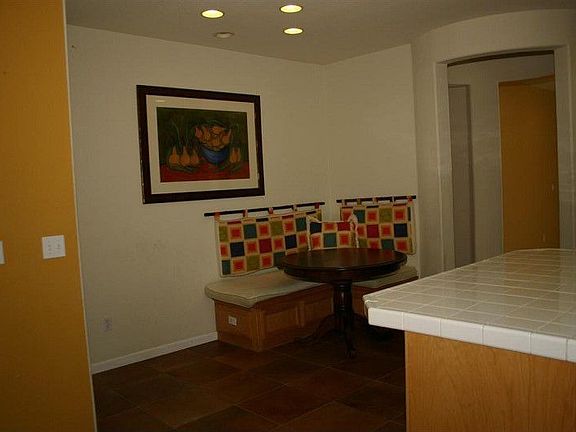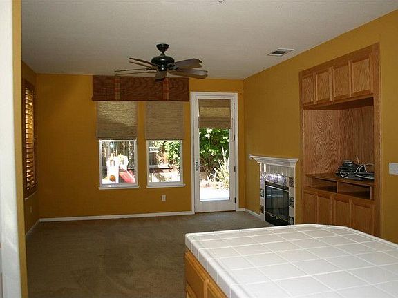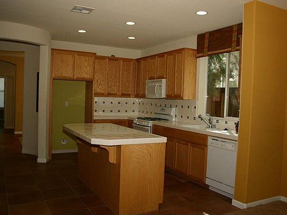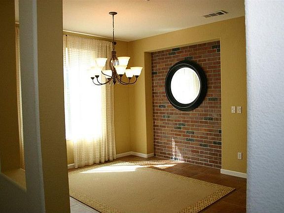 Immaculate home, ready to move right in! Former model, so it has all the nice decorating touches. Upgraded cabinets. Extensive tile flooring. Custom two and three-tone paint. Highly upgraded patterned carpet. Custom window coverings. Brick accent wall in dining room. Plantation shutters on many windows. Wainscotting and chair rail in select rooms. Ceiling fans with light kits. Lovely landscaping in rear yard. Located right across the street from community park, pool and play area. 3 bedroms with den/office. Builder called it a "living room" but most people will use as den/office/playroom.