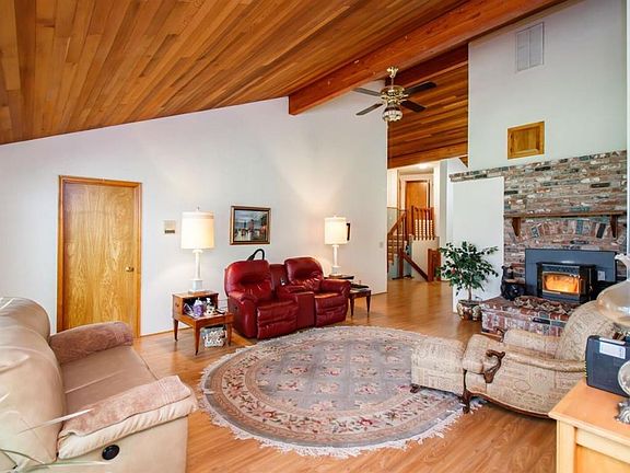 Looking for a large home, great neighborhood and plenty of space both inside and out in East Medford? This is one to check out! Home features vaulted ceiling and with tongue and groove ceiling and pellet stove in the living room. Formal dining room with Quarry stone fireplace. Large kitchen with double oven, gas cooktop and lots of storage. Great for entertaining. 2 Master bedrooms with third bedroom and upstairs bonus room that could be used as a 4th bedroom. Good size private fenced back yard backyard.Covered patio with hot tub included.Small RV parking area. One year First American Home Warranty included.