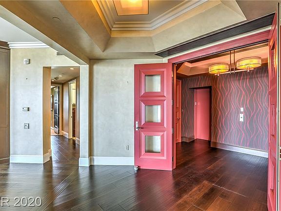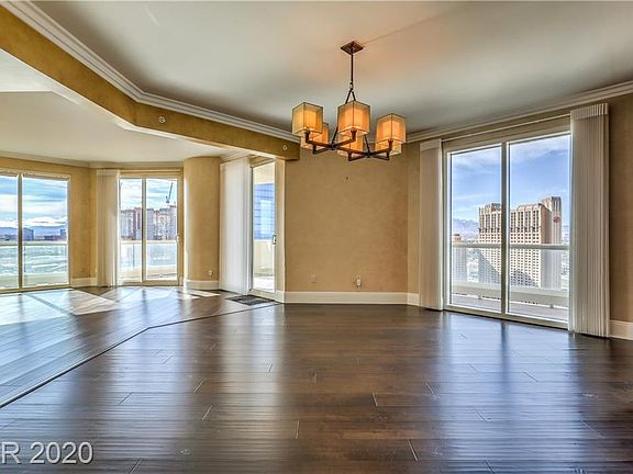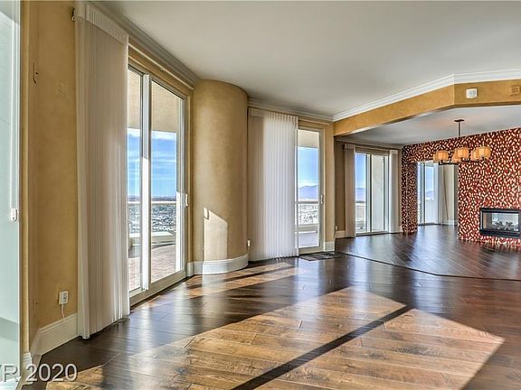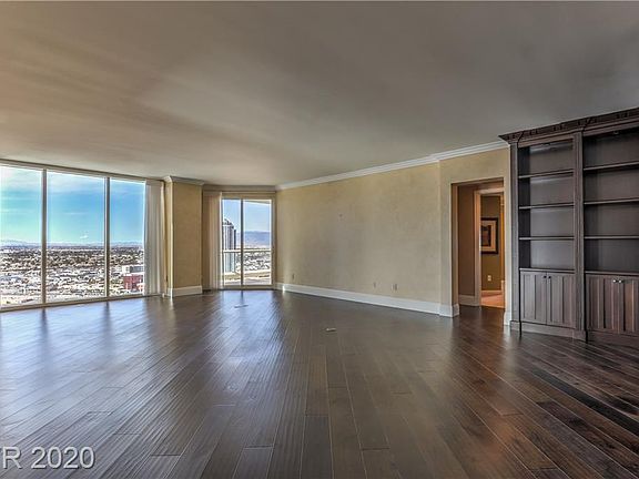 Stunning, contemporary high-rise living with Strip, mountain and golf course views. This exquisitely finished, renovated unit features espresso wood floors, beautiful built-ins, electric blinds, exotic mosaic tile wall, onyx bath fixtures, and design-savvy closets. Custom entertainer's bar is great for hosting, in addition to the large open kitchen with bar-top seating. Floor to ceiling windows throughout each space bring in the sensational city views. Master suite offers separate his/her bathrooms and a walk-out balcony.