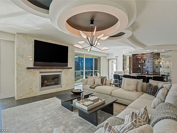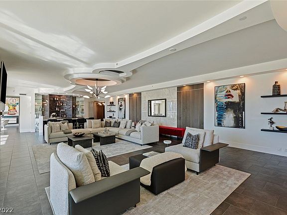 Penthouse level residence on the 31st level showcasing 270 degree view of the Las Vegas strip, downtown, & mountains. This mansion in the skies comes fully furnished. Desirable floorplan, well designed bar, great room, 5 bedrooms, smart office & conference room. Spacious living room w/sweeping views, contemporary look, welcoming kitchen, dining & lounge + laundry room, coat closets & exquisite doors sets this penthouse apart from any other. The HOA fee includes: water, cable, gas, internet, valet, concierge, limo service, security, management & more. The Stirling Club is located on the property grounds, a private membership club offering full spa services including salon, barber shop, massage, nails, facials & other treatments. The club features a large gym, pilates & yoga classes, tennis & pickle ball courts, sauna, indoor & outdoor pools, gourmet restaurant, bars, cigar lounge, Starbucks, wine cellar & tasting room, large spaces available for private gatherings & more. Welcome home!
