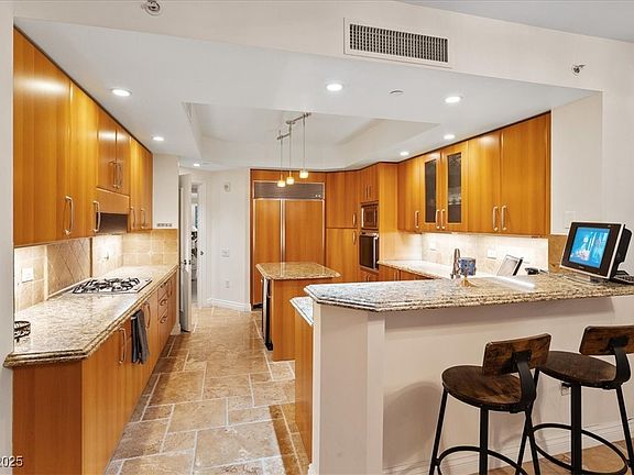 Experience elevated living in this luxurious 3-bedroom condo at Turnberry Place, offering 2,850 sq. ft. of refined interiors and 388 sq. ft. of private balconies with sweeping views of the mountains, city lights, the Strat, Sphere, and lush gardens. Located on the 5th floor and ready for immediate move-in, the home features a grand living room with fireplace, a gourmet kitchen with premium German appliances, three full baths, a spacious laundry room with sink and cabinetry, and generous storage throughout. Residents enjoy top-tier amenities including valet, concierge, limo service, and full coverage of water, gas, cable, and internet through the HOA, unit includes storage locker in the basement. Exclusive access to The Stirling Club adds resort-style indulgence with a spa, salon, gym, tennis courts, pools, fine dining, and private event spaces—making this one of Las Vegas’s most prestigious addresses.
