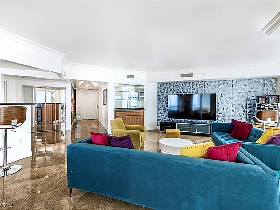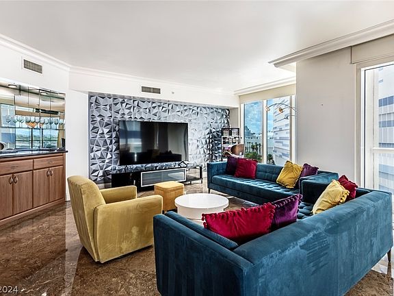 SLEEK AND MODERN DESIGNED CONDO!!!EXPANSIVE OPEN FLOORPLAN WITH ENORMOUS WRAP AROUND DECK FOR ADDED LIVING AND ENTERTAINING. NATURAL LIGHT FLOODS INTO UNIT FROM ALL ROOMS. GORGEOUS STONE FLOORING IN MAIN TRAFFIC AREAS WITH FRESH CARPET IN BOTH BEDROOMS. PRIMARY SUITE SEPARATED FROM SECONDARY BEDROOM FOR TRANQUILTY ALONG WITH LARGE CUSTOM WALK-IN CLOSET, AND AN ENSUITE BATHROOM WITH MARBLE FINISHES, SOAKING TUB, SEPARATE SHOWER AND DUAL SINKS. THE SECOND BEDROOM EQUALLY SPACIOUS AND WELL APPOINTED, OFFERS VERSATILITY FOR GUESTS OR AS A HOME OFFICE. THE BUILDING OFFERS AN ARRAY OF AMMENITIES TO ENRICH YOUR LIFESTYLE. STATE-OF-THE-ART FITNESS CENTER, LARGE 1200+GUEST SUITE, GORGEOUS POOL AREA WITH CABANAS, BBQ AREAS AND LUSH GREENERY. NESTLED WITHIN THE LOBBY IS ALSO A COFFEE AND JUICE BAR SERVING PREMIUM COFFEE. LOOK DOWN ON THE POOL AND GARDEN VIEWS ALONG WITH MOUNTAIN, DOWNTOWN AND PARTIAL STRIP VIEWS. FURNISHINGS ARE NEGOTIABLE.