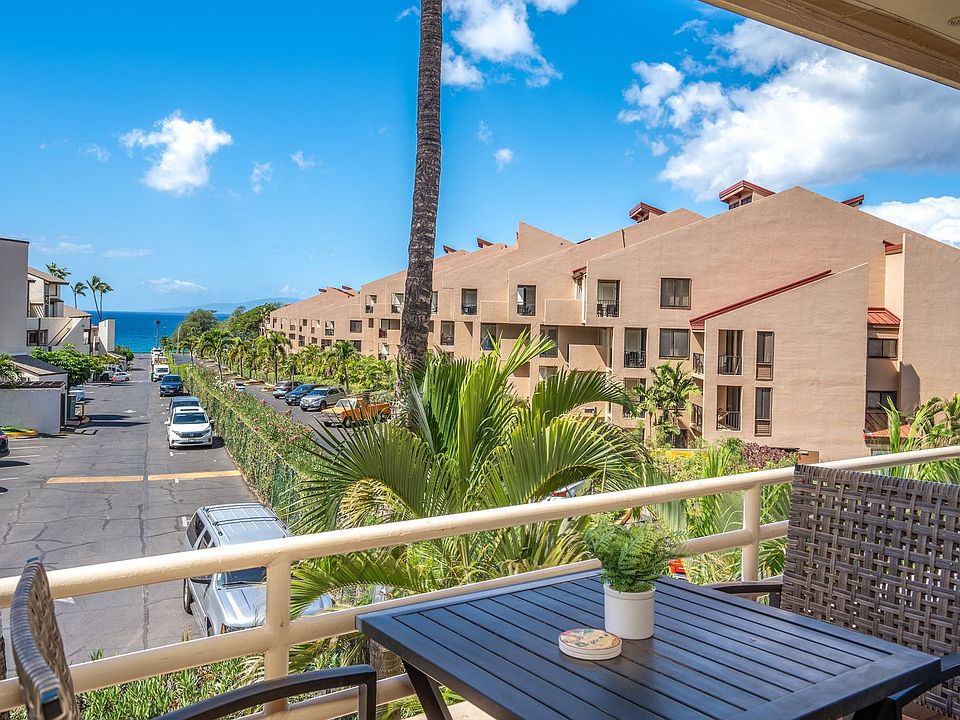Welcome to Kihei Shores unit A-208 with an ocean view, fully furnished approximately 712 sq. ft. with bamboo flooring throughout, open the sliding glass door to your private covered lanai with table and chairs to relax while watching the sunset over the ocean, conveniently located across from Kamaole III beach.