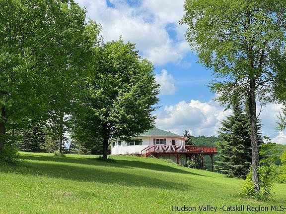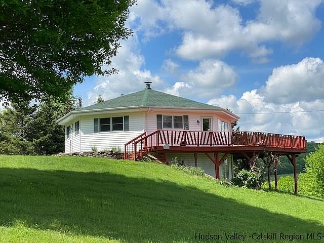 Endless LONG PANORAMIC VIEWS are yours to enjoy from this private bucolic HILL TOP retreat. This lovely well maintained OCTAGON house with large WRAP AROUND DECK and detached OVERSIZED 1 car GARAGE sits strategically in the middle of 36 +/- beautiful Catskills acres with a well balanced mixture of woods and park like open land, fruit trees and plenty of sunny spots for vegetable and perennial gardens. Create your own hiking trails that can be used for cross country skiing in the winter and sledding down the hill will be a blast. A bonfire under the memorable CATSKILLS STARY SKIES will no doubt be a special treat! HUNT on your own land or on nearby State land. A SMALL POND completes the picture. The house offers a large OPEN LIVING/DINNING area with WRAP AROUND WINDOWS so as to never miss a moment of the ever-changing light and views. The beautiful STONE FIREPLACE with WOOD BURNING INSERT is the focal point of the space. Here you will enjoy staying warm and cozy in the chilly fall and winter months while watching the seasons change. The kitchen is bright and has easy access to the extensive deck for outdoor dining and entertaining.The 3 bedrooms, all on the 1st floor, are spacious, bright and each have closets. The 1st floor tiled bathroom is situated in the center of the house. The walk out basement level offers a convenient, practical and large mudroom, a very large DEN/FAMILY ROOM with wrap around windows and access to the outdoors as well as a fully tiled HALF BATHROOM. At this level are also a practical LAUNDRY ROOM and a mechanicals room with plenty of additional storage space for all the extra outdoors gear. There is hot water baseboard heat as well as electric. NEW ROOF in May 2020. The OVERSIZED GARAGE has plenty of room for cars and other riding toys. The second floor is wide open and has a separate private access and small deck. With a little creative vision guest quarters or work space could be created. This is a ONE OF A KIND property that offers so much for the buyer seeking a peaceful and unique retreat. Located just a short drive to the BOOK VILLAGE of the Catskills, Hobart, Bovina, Delhi and Oneonta as well as hiking trails, fishing, hunting and kayaking opportunities. Also within reasonable distance of 4 ski resorts. But frankly YOU WILL NEVER WANT TO LEAVE because everything is possible right here on your own hill top. Don't let this one get away. Call listing agent to schedule your showing.