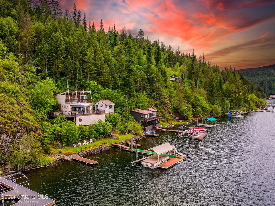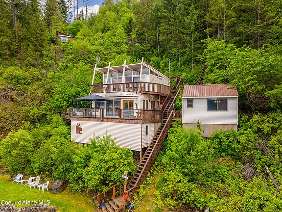 Welcome to your own slice of paradise nestled on the shores of Lake Coeur d'Alene! Boasting 4 bedrooms, 2.5 bathrooms, and 1,158 square feet of living space, this home offers ample room for comfortable living and entertaining. Prepare to be mesmerized by the captivating views of Lake Coeur d'Alene from nearly every room in the house. Whether you're enjoying your morning coffee in the kitchen, unwinding in the living room, or relaxing on the expansive deck, you'll be treated to breathtaking vistas that will never cease to amaze. In addition to the main house, this property also features a charming 1 bed, 1 bath guest house, providing a private retreat for visitors. Step outside and enjoy your own lakeside lawn, private beach, 3 docks & firepit area. 6 parking spots plus a tram to make it easy to get your things down to the home! Situated on a generous .97 acre lot, there's plenty of space to spread out and enjoy the great outdoors. Don't miss your chance to own this lakefront retreat