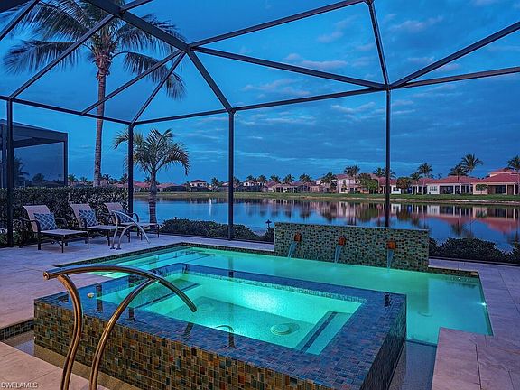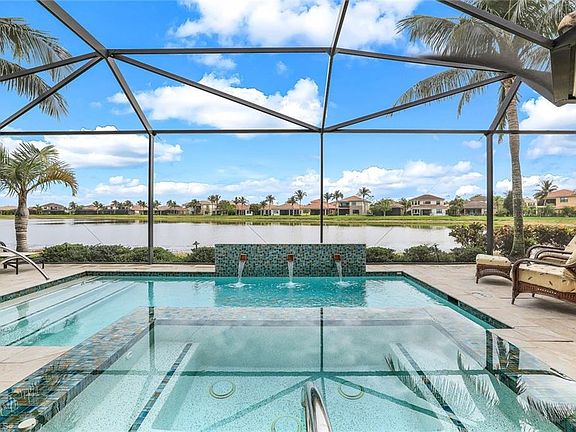A captivating lake view awaits behind the gated courtyard of this elegant, coastal-inspired estate home. The coveted Carlyle floor plan is entertainer's dream, featuring an open layout where the wet bar, great room, dining area and kitchen all flow seamlessly to the outdoors. Live like you are on vacation every day in the large screened lanai with travertine marble deck and gorgeous saltwater pool & spa, accented with colored tiles that sparkle like gems, LED lights and waterfall features. Thoughtfully crafted and meticulously maintained, no detail has been overlooked, so you can move right into this fully furnished home. The gourmet model view kitchen, with center island, abundant level V white cabinets, ambient lighting, vented hood, new Bosch refrigerator, granite counters and glass tile backsplash, is simply stunning. Enjoy the lake view from luxurious primary suite, which features a spa-like bath. The unique Club Room is versatile, working well as an office, guest space or home theater. The two guest suites each have walk-in closets and their own full bathrooms, plus there is an additional “pool bath” off the great room. Luxurious appointments include 24” porcelain tile flooring throughout, crown molding, marble countertops in bathrooms, decorator lighting & fans, and custom window treatments including motorized shades. It’s easy to stay organized with California Closets throughout, and the laundry room includes a long folding counter, ample cabinets, a sink and new W/D. Two newer A/C units will keep you cool even on the warmest SWFL days. Easy to maintain flooring nicely finishes the garage. Additionally, the exterior was freshly painted in 2023. Located in Riverstone, a social, vacation-inspired community zoned for "A" rated schools. Recreation area includes a fitness center, social hall, resort & lap pools, spa, 5 Har-Tru tennis courts, basketball & pickleball court, tot lot and activities coordinator. Now is the time to enjoy the Naples lifestyle you have been dreaming of.