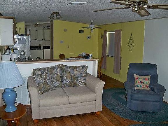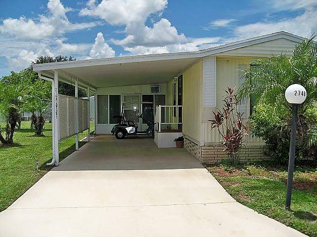 This 2 BR 1.5 BA home has a split floor plan, The home features, Inside Laundry, 9 X 10 Master With half Bath, 10 X 10 Guest BR, 12 X 13 Living Room, 12 X 12 FL Room, 8 X 11 Kitchen with lots of storage and pantry, And 7 X 9 Dining area. Outside well kept landscaping with pygmy palm trees, 12 X 39 Carport, 4 X 8 Covered areas for grill, and wooded entry way steps and Deck. Golf Cart Included