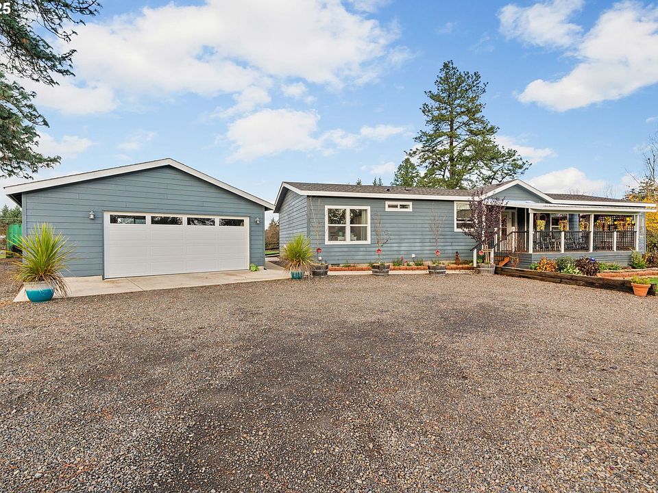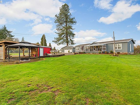 Rare country find just minutes from town in Alvadore! This charming 0.65-acre property features a well-maintained 3-bedroom, 2-bath manufactured home on real property, offering a spacious primary suite with a private bathroom and walk-in closet. The home includes LVP flooring throughout, abundant natural light, furnace and mini-split system for heating and A/C for year-round comfort. The kitchen is beautifully updated with stainless steel appliances, island, and granite countertops. Additional highlights include a laundry room, covered decks in both the front and back, a covered outdoor entertaining area with a firepit, a large 2-car garage, and RV or boat parking. Quiet country living with quick access to town—this one is a must-see!