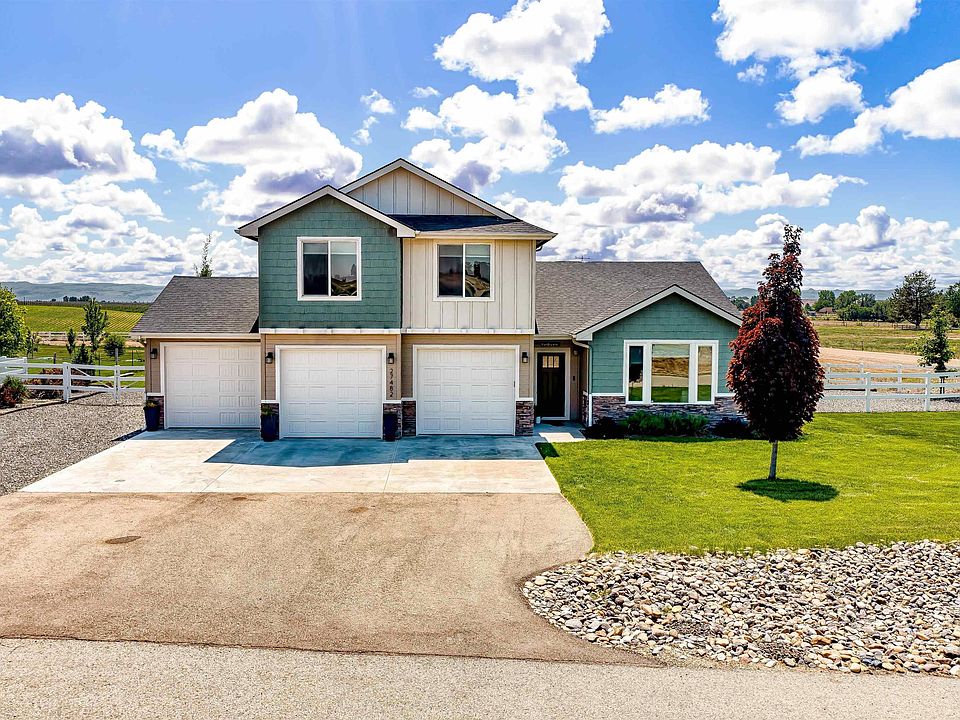 BEAUTIFUL, meticulously manicured acreage home with large windows for abundant natural light and custom floor plan. Master Suite on the main level with garden soaker tub, separate walk-in shower, dual vanities, and XL walk-in closet. Upstairs offers three more large bedrooms and full bath. Covered patio to enjoy the tranquil quiet of this country setting, watch the stunning sunsets, amaze at the views of the Owyhee Mountains, green fields, and your horses in the back pasture! Gaze at the stars while s'mores roast in the fire pit. Room for all your toys and a workshop with 3 extra-deep garage bays, epoxy floor, RV pad, and 6-car driveway. No HOA!!! Fully fenced backyard and separate pasture for animals of all sizes--with built-in sprinklers throughout! Brand new exterior paint (2023) and new HVAC system (2021). Plenty of room for a custom shop of your dreams or hobby farm set-up. Truly a must-see to appreciate!