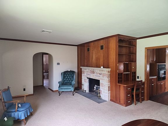 - Description: Carpet, hdwd under, stone fireplace, built-in desk