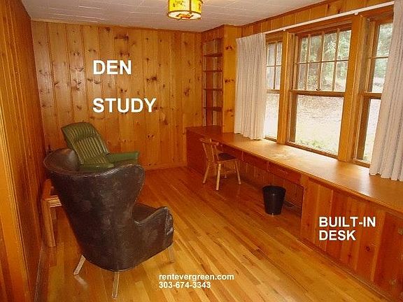 AVAILABLE THROUGH MAY 31,2023 = Available for 6+ MONTH LEASE ONLY, FURNISHED LODGE ON 7 MOUNTAIN ACRES, MT. EVANS - SNOW CAP VIEW, Very Private yet Close to Town, Hardwood Floors, Knotty Pine Paneling, Native Rock Fireplace, 2 Bedrooms,1 Full Bath, Den-Study with built-in desk, Natural Gas Heat, Washer & Dryer Included, All Furniture Included - must remain on site. 1 additional small room is not currently furnished. Kitchen accessories are minimal. Very Good Credit and Verifiable Income Required. Prefer NO Pets due to owner's allergies but may consider one dog if not regularly left unattended. No Smoking. $2,500.00 Security Deposit. Tenant pays natural gas, electric, trash service and snow plowing if desired. TENANT pays natural gas, electric, trash service, and snow plowing if desired.