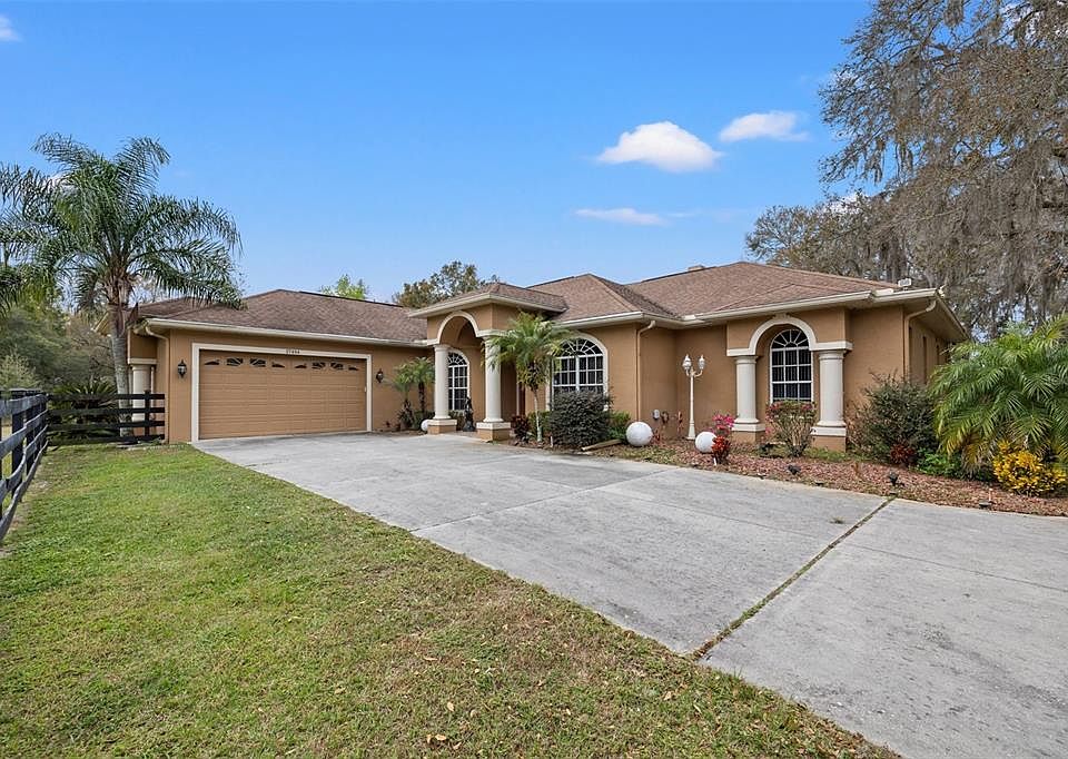 Experience Southern living in this 4-bedroom, 3-bathroom pool home set on nearly 4 acres in Brooksville, Florida. The master suite is a retreat with its spacious layout, soaking tub and dual walk-in closets. The living room boasts tall ceilings and a cozy gas fireplace, creating a warm and inviting atmosphere. A dining room and versatile office, which could easily serve as a 4th bedroom, provide flexibility for various lifestyles. The kitchen and indoor laundry room feature ample cabinets and storage, making daily tasks a breeze. The house is pre-wired for surround sound and has updated flooring in the bedrooms. Step outside to your private oasis – a sparkling pool with a recently replaced motor, enclosed in a caged lanai for year-round enjoyment. The property is fully fenced with stately gates, ensuring privacy and security. For the business-minded, a spacious warehouse awaits, equipped with three tall roll-up doors, its own office, and a bathroom. An additional garage and a shed behind the home offer even more storage options. The property features a well with an attractive housing, two septic tanks, a water softener and is pre-wired for a generator. The HVAC system is new, providing energy efficiency. Enjoy the convenience of living in a designated trail town, with the Good Neighbor Trail and Withlacoochee State Trail near by which offers over 40 miles of trails to ride horses, walk or bike. There is also a boat ramp and a fishing pier, all with free admission. Bring your canoes, kayaks, fishing poles and enjoy this hidden gym. This property offers endless possibilities for a comfortable and vibrant Florida lifestyle. Schedule your viewing today and make this dream home yours! Seller will contribute up to $10k for rate buy down or closing cost concessions.