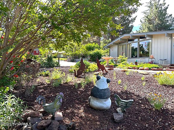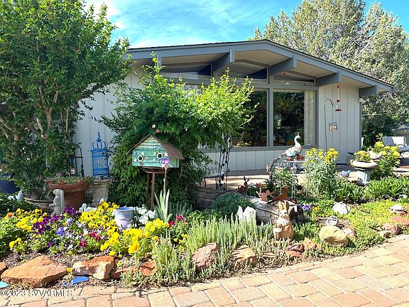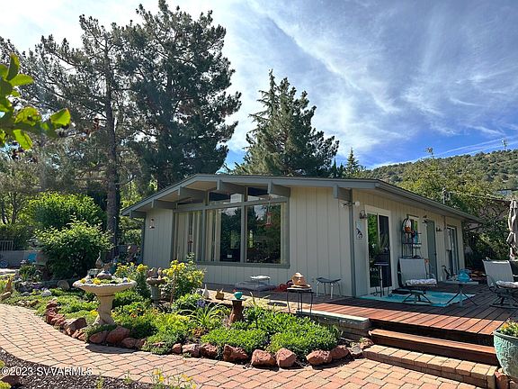 This is about as sweet as it gets. This delightful bungalow is a captivating and magical enclave ensconced in the heart of W. Sedona. Built in 1973, this bright & light residence boasts: 2 BR, 2 BA, 1062 sq. ft., .25 acre lot, Coffee Pot Rock views, hardwood floors, newer redwood deck, newer roof (2020), large picture windows, vaulted ceilings, paver driveway, entrance gate and truly enchanting landscaping. There is a lovely small lawn, numerous flower beds, pathways, large shade tree, garden shed and apple, pomegranate, plum, fig and Asian pear trees. Recent exterior paint (2021), several newer Anderson windows. On sewer and natural gas. Stone fountain of woman is included.