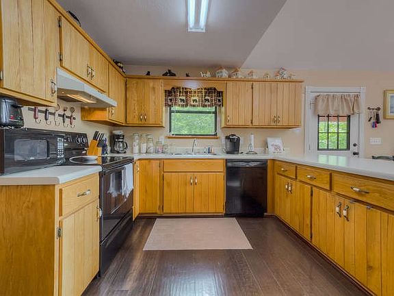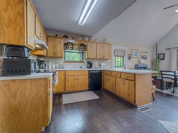 This 2BR/2BA wood chalet on 2.05 acres has VIEWS to be enjoyed from an open deck or the covered porch! Dark wood floors contrast nicely the lighter wood cabinets and complement the neutral paint scheme. The open kitchen, dining and living area paint palette is drawn from the pretty field stone fireplace. Two sliding doors and windows flood the space with light and give broad long range views from the main level and the loft. Large level gravel parking area for guest and family.