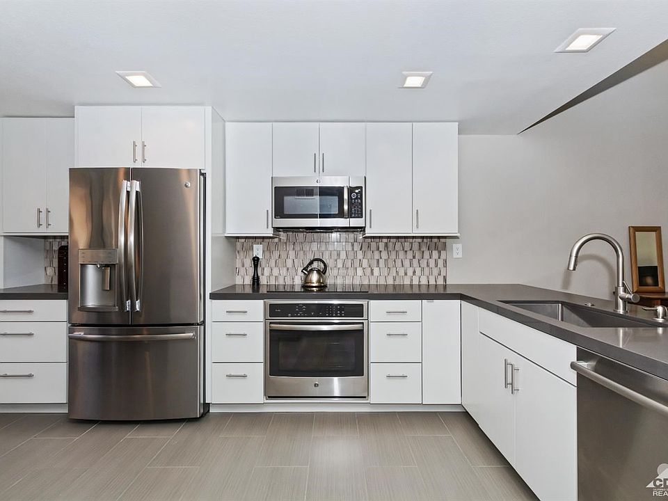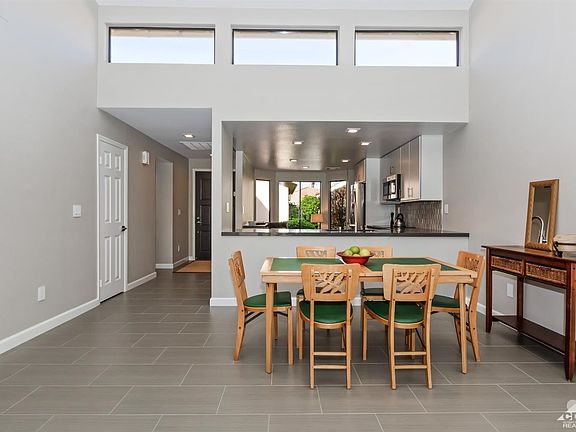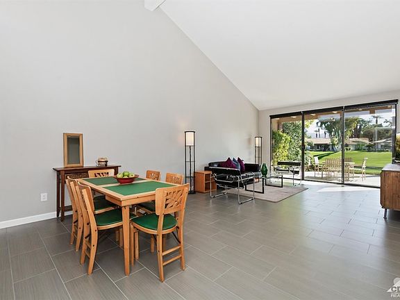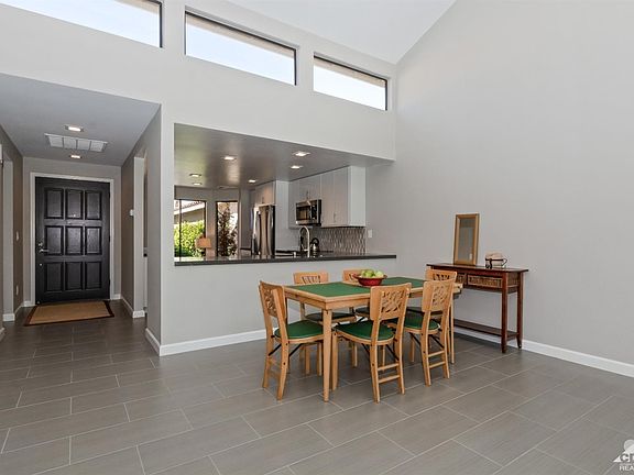 Serene lakeside view from re-imagined 20 plan at Monterey Country Club. 2 bedrooms, 2 baths with master bath showing off a total remodel featuring huge walk in waterfall shower. Clean uncluttered contemporary lines and colors in all updating. Master and living room face the gorgeous southwest mountain view. Lushly landscaped gated entry courtyard with direct access from the 2 car garage. Bay window in the New contemporary kitchen with top of the line stainless appliances. Property is turnkey furnished per inventory. Great opportunity to move right in this gorgeous place with such a beautiful, relaxing lake and golf course views. Monterey Country Club is a gated golf course community (with no initiation fee) featuring a full slate of activities in the convenient heart of Palm Desert.