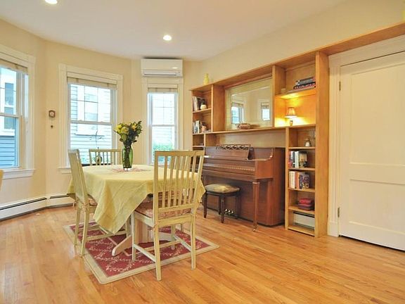 This first level, three bedroom condo is located less than five minutes from Fresh Pond. With high ceilings and hardwood floors throughout, in unit washer/dryer and a flexible layout, this unit is perfect for entertaining. The kitchen features granite countertops, stainless steel energy star appliances, and an eat in island (perfect for hosting or just having breakfast). Off of the kitchen is the half bath as well as the spacious dining/living room area. Complete with a gas fireplace, built in shelving and large sliding doors leading out to the private back deck. A main hallway leads to the units three bedrooms and the full bathroom, which features a classic tub/shower classic. Ample closet space, mini-split air condition units and one assigned off street parking space complete this offering. Convenient to public transportation, area parks, shopping and restaurants. Pet Policy: one cat only.