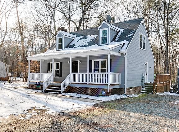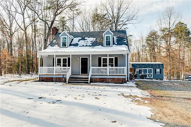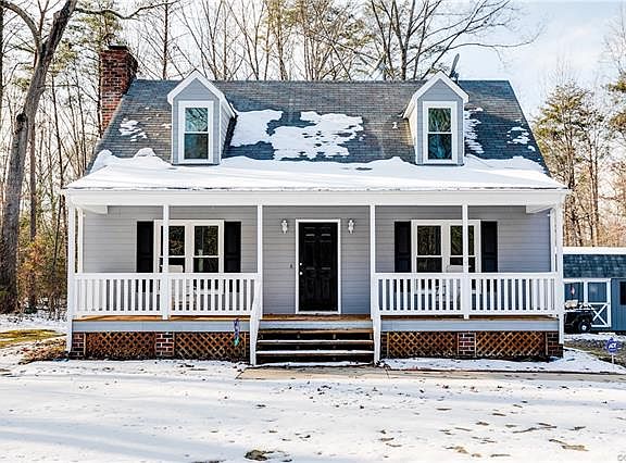 Welcome home to 275 Corann drive! Perfect location, only minutes to central garage with tons of restaurants, Food Lion and close to King William HS. This two-story Cape style home, offers 3 bedrooms, 2 bathrooms with a full front country porch. In the living room offers hardwood floors with raised brick wood burning fireplace and mantle. Living room connects to the eat-in Kitchen with newer vinyl floors, wood cabinets, white appliances. Downstairs bedroom makes for a great guest room or in-law suite, with full bathroom downstairs. Upstairs there are two bedrooms. Master bedroom with ceiling fan, storage access, huge closet. Ceiling fans in all bedrooms. Updated light fixtures. Vinyl energy efficient windows. Two detached sheds. One of the sheds comes with electricity, double doors and already pre-run for cable tv! Huge rear deck, great for entertaining guests and cook outs this spring! 1 ACRE lot that backs up to woods.