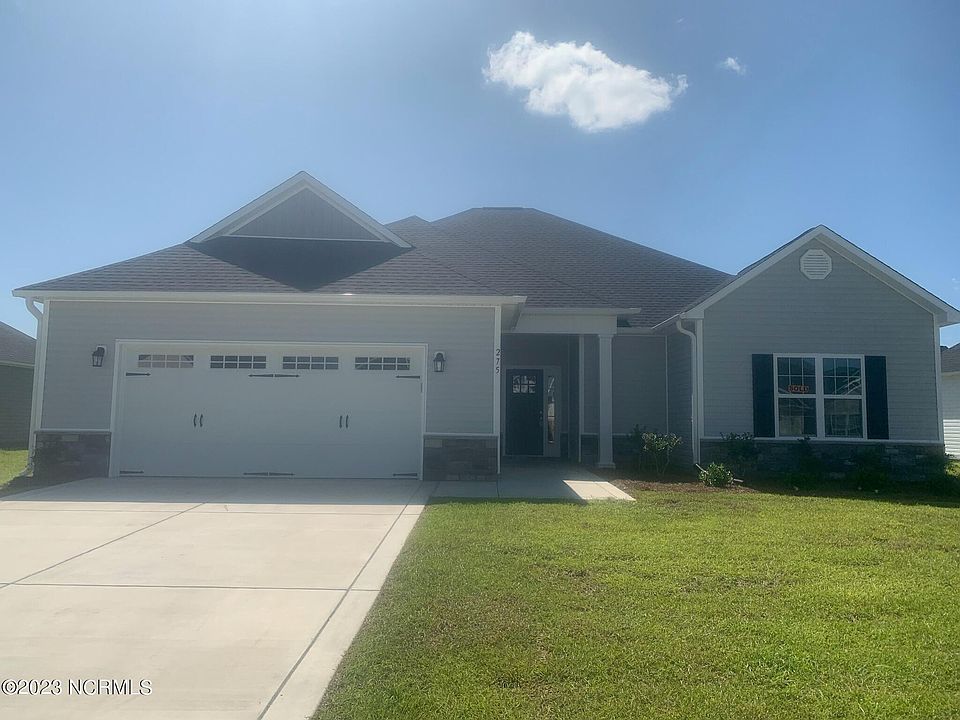 Welcome to the highly desired & popular community of Onslow Bay. Brand new construction built by Onslow County's most trusted & preferred builder, featured in Builder 100/ Top 200 Builders in the country. Onslow Bay is a hot spot, 3 miles to MCB Camp Lejeune's Piney Green gate, 14 miles to New River Air Station & minutes to area schools, shopping & dining. This beautiful neighborhood is sure to impress, complete with a clubhouse area & community pool. The Raegan is a Sydes exclusive floor plan, 1916 heated square feet, split floor plan with 3 bedrooms and 2 bathrooms. A quaint front porch welcomes you home into a magnificent 18x23 family room with a cozy corner fireplace. The master suite will feel like a private retreat, 17x13 with dual closets and a luxurious master bathroom. The master bath is a spacious 11x13 with double vanity, separate shower, and soaking tub. The kitchen is sure to impress with beautiful flat panel, staggered cabinets, and stainless-steel appliances to include smooth top range, dishwasher, and microwave. Eat-in kitchen is open to a 9x12 dining area. Bedrooms two and three have ideal walk-in closets. 2-car garage and a covered back porch. Call today. NOTE: Floor plan renderings are similar and solely representational. Measurements, elevations, and specs may vary in final construction. Limited selections for buyer to choose. Kitchen will have pantry cabinet beside refrigerator instead of countertop. Call L/A to verify.