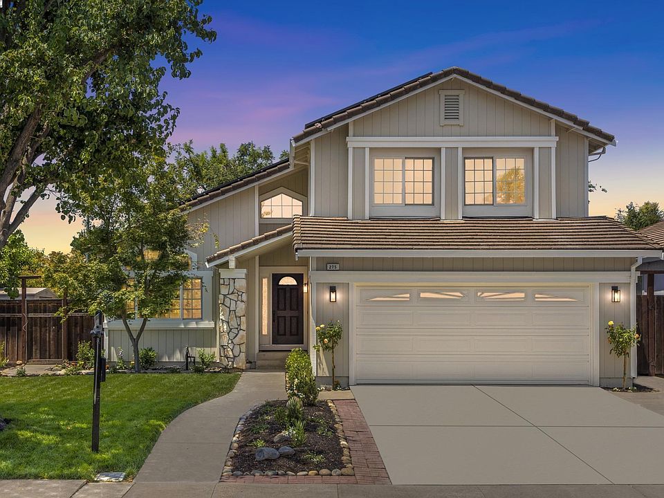 Fabulous 2-story home, updated from top to bottom, inside and out! All new luxury vinyl plank flooring throughout main level and upstairs bathrooms, new carpeting in bedrooms. Spacious living room and dining room with vaulted ceilings, recessed lighting and loads of natural light. Beautifully updated kitchen with white cabinets, quartz countertops, garden window and built-in desk - open to warm and inviting family room with sliding glass doors to park-like back yard. Inside laundry room and half bathroom on main level. Spacious primary bedroom suite with vaulted ceilings, walk-in closet and updated ensuite bathroom. Two additional bedrooms and updated hall bath upstairs. Aquasana whole house water filter, OWNED 4.9kw solar. All new landscaping front and back - huge lawns, patio areas and side yard with storage. Close to schools, parks, shopping & more!