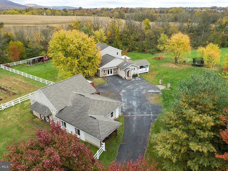 Welcome home, down a private drive on 1.87 ac w/horse paddocks. Enter & notice vaulted wood ceilings & beams, ample storage & laundry. Move to the FR w/wood-burning stove & brick hearth flowing into the kitchen w/tile floor, backsplash & newer appliances. An abundant amount of natural light in both the LR and DR w/propane FP. Remodeled 1st Fl bath. Huge GR perfect for entertaining flooded w/light & ample closet space. 2nd Fl full bath w/new flooring, tub/surround, vanity & paint. Primary BR beams with natural light. Primary bath is remodeled w/new vanities, mirrors, & fixtures. 2 additional BR finish the 2nd Fl. Enjoy the basement w/movie projector/screen, bar & finished space w/barnwood wall. Outback, a large deck partially under roof w/wood ceiling, fan, tv, sink & bar. The barn can accommodate horse stalls, farm equipment, & more. A 2-car oversized garage completes the outside. New windows, flooring, exterior/interior doors, paint, trim & crown molding. This home is move-in ready!