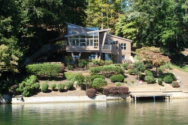 Unique custom contemporary/modern home with Scandanavian influence features walls of windows to bring the lake views in. Large main-level master suite features his/hers closets and tiled bath with double vanity, garden tub and separate shower. Living room overlooks lake lure, centered by a gas fireplace with slate surround and adjacent balcony for more views. U-shape kitchen has granite countertops, electric cooktop, wall oven and microwave, refrigerator and pantry storage. Upper loft is perfect as a private retreat, home office, or TV nook. A cozy sitting area with lake views accents the lower level with two bedrooms and a full bath. Beautifully landscaped lakefront "yard" leads to a massive over-the-water deck with kayak and boat tie-ups. Stone seawall has walkway across lakefront, highlighted by a stone patio and firepit. Recent upgrades include propane on-demand hot water, whole house generator and massive concrete block retaining wall to reinforce on-street parking. One-of-a-kind!