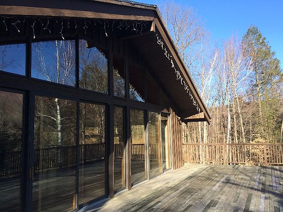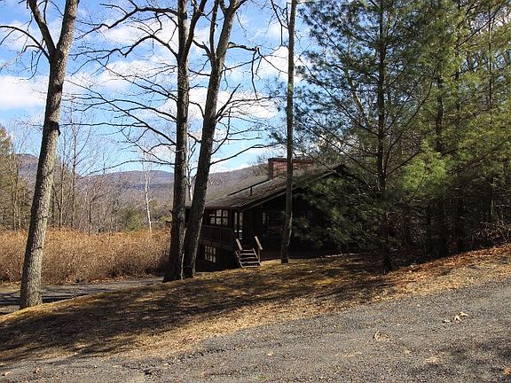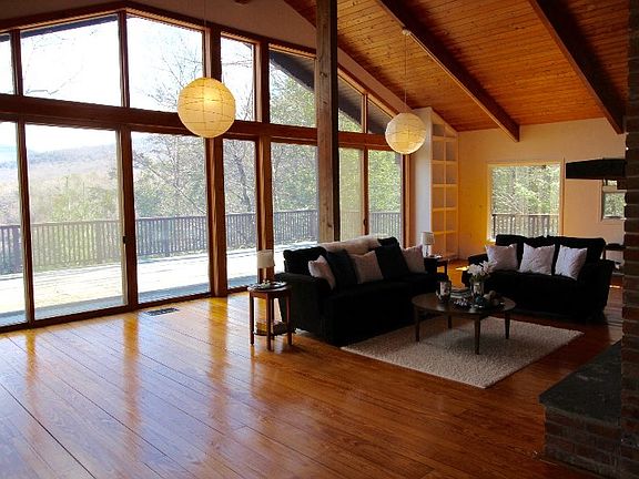 Incredible new price for a stunning Woodstock getaway with spectacular mountain views and privacy. Open floor plan living: central fireplace, half bath and wraparound deck up,two bedrooms down with doors to the bluestone patio, two luxurious baths (one a shower room) with radiant heat. Separate, flexible use two car garage plus extra shed could be work space, studio or storage. Ten plus acres, year 'round stream below and priceless views. Pure peace, just minutes from town. Motivated seller.