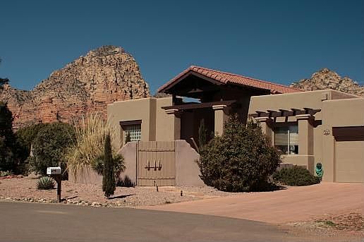 This single family home boasts grand style and impressive views of Coffee Pot and Thunder Mountain. The property is nestled in a quiet, elevated, cul-de-sac yet is near W.Sedona's shops and businesses. This spacious home, engineered by Casa Natural, has 13ft ceilings in the living room and 10ft ceilings in dining room, kitchen, master bed/bath. The remodeled kitchen features a 6-burner dual-fuel Viking range with a powerful vent hood, KitchenAid stainless steel appliances, custom cabinetry and granite countertops. The front courtyard features a tiered fountain and leads to an impressive high-roofed porch. The rear courtyard offers serene landscaping & fixtures including a sunken spa, fruit trees, beehive oven, water feature and a cobblestone patio. It can be reached by 4 doorways from the master & guest bedrooms, dining room & kitchen. A stunning bamboo overhang provides ample shade. Owners to pay for standard homeowners warranty. Owners are licensed agents.