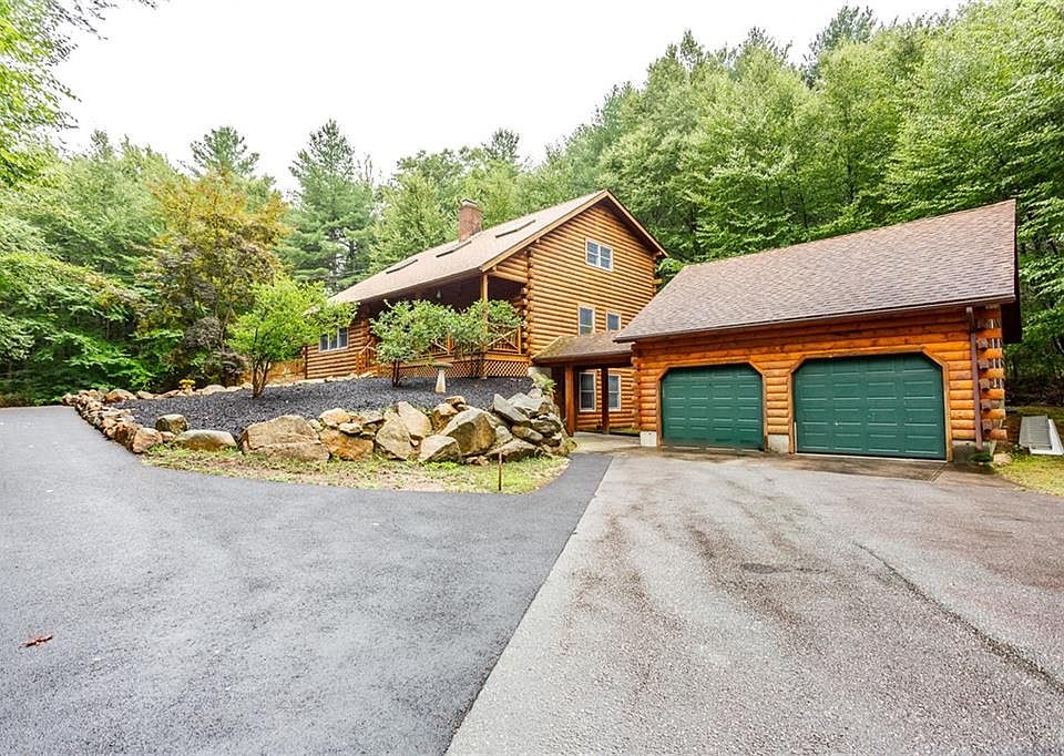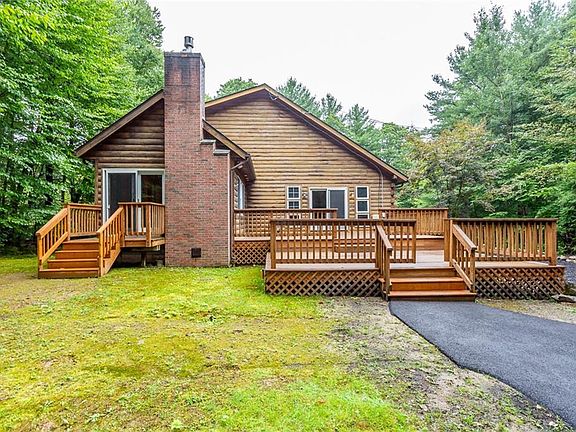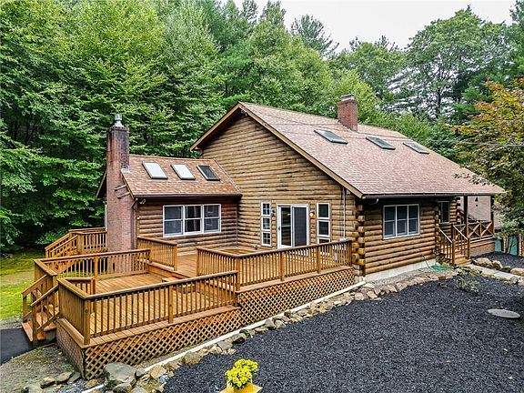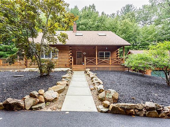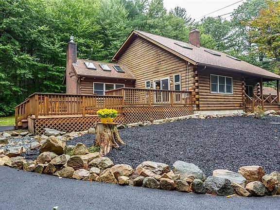 Nestled among the towering trees on a serene two plus acre lot, this charming 3-bedroom log cabin offers a retreat that combines rustic beauty with modern comforts. Tucked away from the road, the beautifully manicured front yard provides a perfect view while sitting on the wide front porch sipping your morning coffee. Stepping inside, you're welcomed into an open-concept living area, where the soaring ceilings with exposed wooden beams instantly create a wow factor. The living room centers around a grand stone hearth with a wood burning stove, inviting you to gather around during chilly evenings. Large windows flood the room with natural light and offer unobstructed views of the surrounding woods, creating a seamless connection between the indoor and outdoors. Step outside onto the spacious two level deck perfect for outdoor entertaining, stargazing, or simply breathing in the crisp woodland air. Adjacent to the living area is an open kitchen that combines rustic charm with modern convenience. An additional living room with a gas fireplace provides even more space to entertain or for everyone to spread out. There are two generous bedrooms on the first floor, each with a mini split for air conditioning. The second floor offers a large bedroom, second full bath and a loft open to the lower level. This unique property is a showpiece, and should not be missed!