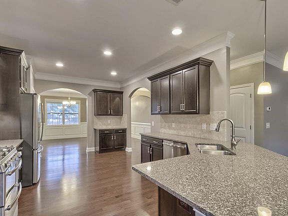 - Kitchen: Counter Tops-Granite, Eat In, Floors-Hardwood, Cabinets-Stained, Backsplash-Tiled