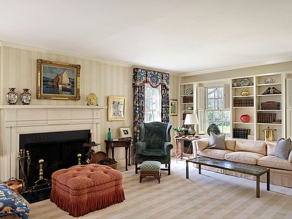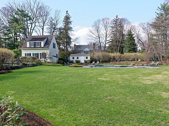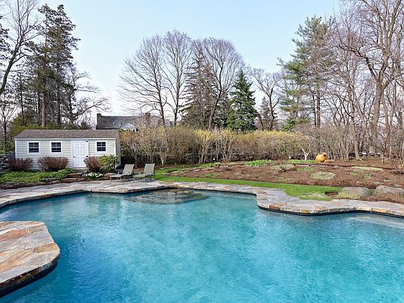 Gracious Colonial emanates quintessential New England charm amid the privacy of two gorgeous in-town acres with a heated pool. Elegant 5,500+ SF interior, thoughtfully updated and enhanced with beautiful additions, features fireplaces and 3-exposure views in front-to-back living room and magnificent paneled family room walled with sliding French doors to a picturesque terrace. Paneled library with wet bar; granite-appointed kitchen with brick fireplace; bay-windowed breakfast room; powder room; spacious recreation room. Six bedrooms, five baths, private study and office in family quarters. Three-exposure master wing with fireplace, built-ins, two walk-in closets. Two-car garage with studio; town utilities; generator; walk to Greenwich Country Day school.