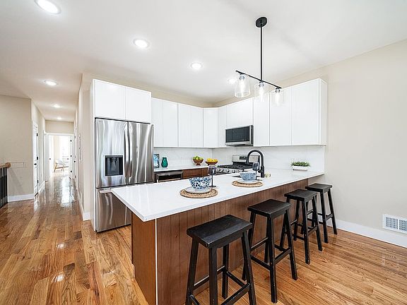 This new construction, two-family home in Jersey City’s hottest neighborhood offers an ideal opportunity for both luxury living and passive income potential. Set on a quiet tree-lined street, the paver driveway and careful landscaping allow immediate curb appeal, while the interior hosts classic design and modern finishes suited for luxury living. Both units host spacious 3-bedroom floorplans, each with private outdoor space, as well as a two-car garage equipped with an EV charger. Light streams through the oversized windows and onto the bright open-concept living space with gleaming hardwood floors. The eat-in kitchen is designed with modern white quartz countertops, a matching backsplash, and a mix of sleek white and natural wood cabinetry, complemented by matte black fixtures and stainless steel appliances. Unit 1 boasts a spacious two-story layout with three bedrooms, two and a half baths, and a bonus room that includes a custom wet bar. Step outside to the private backyard perfect for outdoor gatherings and daily relaxation. Unit 2 mirrors the elegance with three bedrooms and two baths. Plans and partial completion of the full-size roof deck give the unique chance to customize this property to your liking. The primary ensuite features a large walk-in closet and a private balcony accessible through sliding glass doors. Bathrooms boast thoughtful features like floor-to-ceiling tile, smart mirrors, double vanities, and either an oversized shower or a soaker tub combo. Situated in one of Jersey City’s hottest markets, this property offers easy access to the Light Rail, PATH, and ferry connections, as well as nearby attractions like Liberty State Park. With ample storage throughout and classic finishes that exude timeless appeal, this home is perfectly positioned for both convenience and style in a thriving community.