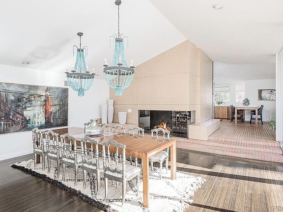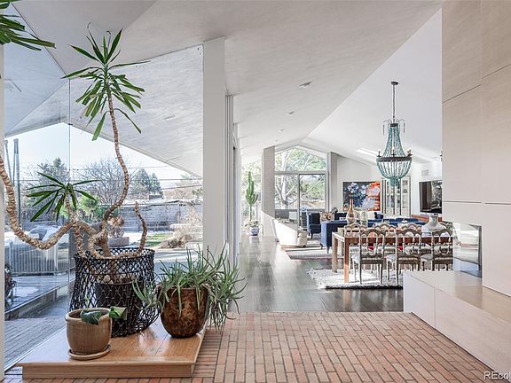 Frank Lloyd Wright partner + renowned architect Aaron Green artfully crafted a timeless shrine to Denver's mid-mod history in this 3 bed, 3 bath home located on an oversized 17,200 sq. ft. lot in Hilltop. A low exterior profile + a vast outdoor space envelop this home, directly influencing the interior's abundant natural light + coveted mountain views. Vaulted ceilings + walls of glass surround the interior, from the illuminated kitchen + dining space to a vast open living area anchored by an immense fire feature and crowned w/ designer lighting. A glass-lined hallway escorts residents to a divine primary suite w/ ample storage + a luxurious bathroom. Thoroughly wrapped in brick accents + contemporary wallpaper, this home boasts exquisite touches at every turn. An additional living area sits beneath skylights + recessed lighting, leading to a sunken den w/ a wet bar and backyard access. Al fresco entertainment is masterfully achieved with a custom outdoor kitchenette, covered patio and generous space for gatherings both intimate and lively.