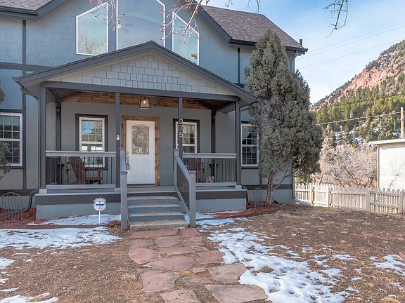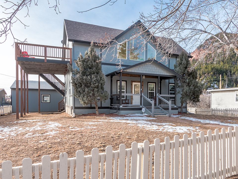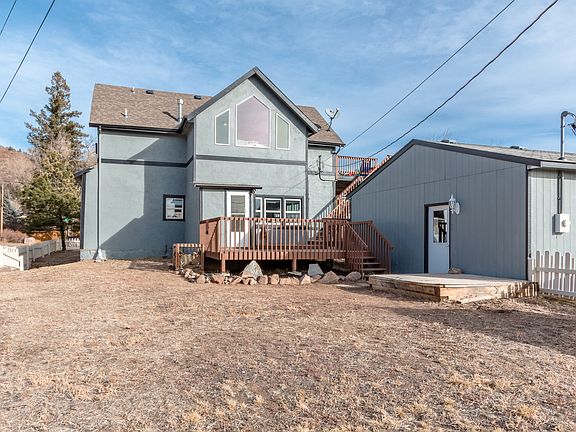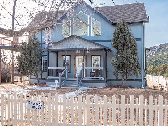 Historic Original Palmer Lake School House. Updated with stainless /granite kitchen, glass fronted pantries, hardwood floors. Mud room. Kitchen walks out to large deck. Main floor full bath and bedroom with walk in closet. Entire upper level is a magnificent master suite with soaring vaulted ceilings, two large picture windows, attached bath w/jetted tub, walk in closet and huge upper level deck. Finished family room in basement. Large level lot with detached oversized 2 car garage. Storage shed. Large level fenced lot with gorgeous mountain views. Short walk to hiking trails, library, school and restaurants. Neighborhood Description Small town America at it's best. Walk to the library, ice cream parlour, restaurants, park, and hiking trails. With a population of only 2500 and nestled against the mountains, you will think you have stepped back in time sitting on your covered front porch on a quiet country lane.