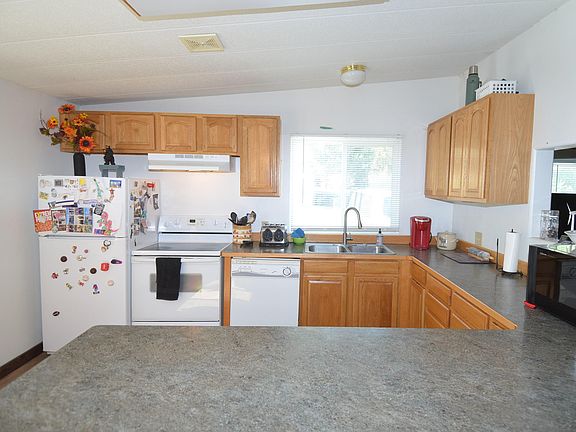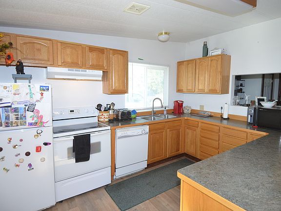 Welcome to this charming 1981 Parkway manufactured home, situated on a .91 acre lot with beautiful views and plenty of parking. This cozy home offers new laminate flooring throughout the main living space and a vaulted living room ceiling, creating a bright and airy atmosphere. An open concept kitchen with ample counter space makes cooking a breeze. The home also boasts two bedrooms, two bathrooms, and a laundry room. Outside, a 24x24 shop with concrete floors, man door, garage door, 220 power for an RV and an insulated storage room provides plenty of storage options. The .91 acre lot includes a large parking area, city water, septic tank, and a covered back deck which provides a great spot to enjoy your view. Vinyl windows throughout the home add to its efficiency. Propane on demand hot water heater. Fresh exterior paint.