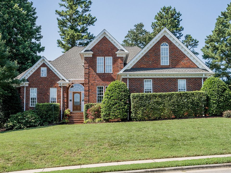 Stunning custom all brick home w/ side entry oversized garage overlooking 9th hole in golf community. Gleaming hardwood floors, transom entryways/custom trim in 2-story foyer & throughout 1st floor. Dining rm w/ coffered ceiling/wainscoting. 2-story family rm w/ gas FP. Chef's kitchen: tons of cabinets, granite counters, gas cooktop, SS appliances & pantry. Eat-in breakfast area.1st floor master BR w/ jetted tub/sep shower, double vanities, WIC. 3BR + Bonus rm up including Suite w/private bath.
