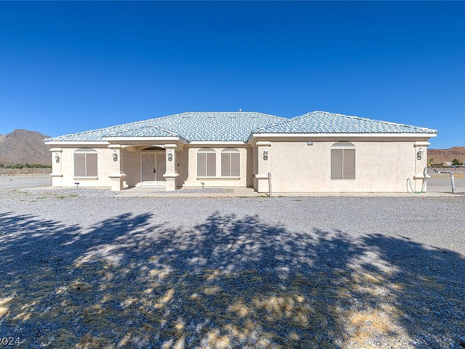 Amazing mountain views.This home you'll discover comfort&convenience.As you step through the double door entry into an open living space w/a well-appointed kitchen.3bed2baths.2 primary beds,offer privacy for residents&guests.The heart of the home lies in its primary bedroom w/luxurious en-suite bath&oversized closet.Natural light fills through the blinds in all windows.Step outside to your private oasis 4.4 acre lot is fully fenced w/a 5ft chain link sub-yard off the back porch ideal for relaxation&outdoor entertainment.Roll-up solar screens adorn the back porch,offering shade&comfort during sunny days,solar screens on all windows for energy efficiency.For those w/a green thumb adorn fruit trees in the front yard.2 car garage ensures ample space.Add.Amenities incl.animal shed w/carport shader perfect for sheltering beloved pets/storing outdoor equipment.This well designed home has every detail to provide comfort&security.Don't miss your opportunity to make this your forever home!