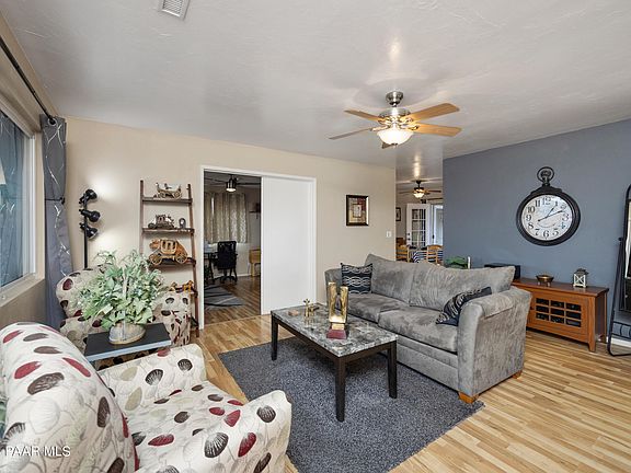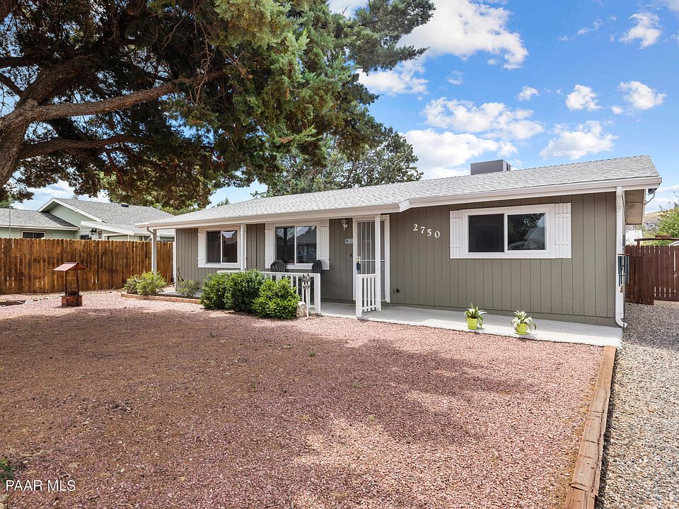 2750 Date Creek Drive, a tastefully upgraded gem conveniently nestled in the heart of Prescott Valley. This home boasts remarkable curb appeal, framed by a majestic mature shade tree, while the exterior's recent 2022 painting crowns a series of impressive updates. A brand-new roof and HVAC system within the past two years offer peace of mind. The lot provides sweeping views of Glassford Hill, and hints of Mingus Mountain grace the front porch. Exterior shutters and lush gardening beds create a welcoming atmosphere, complete with a security screen door. Step inside to a captivating living area adorned with laminate wood floors that seamlessly flow into the third bedroom. The stylish kitchen is a focal point, featuring rejuvenated cabinetry, stainless steel appliances, and double vessel