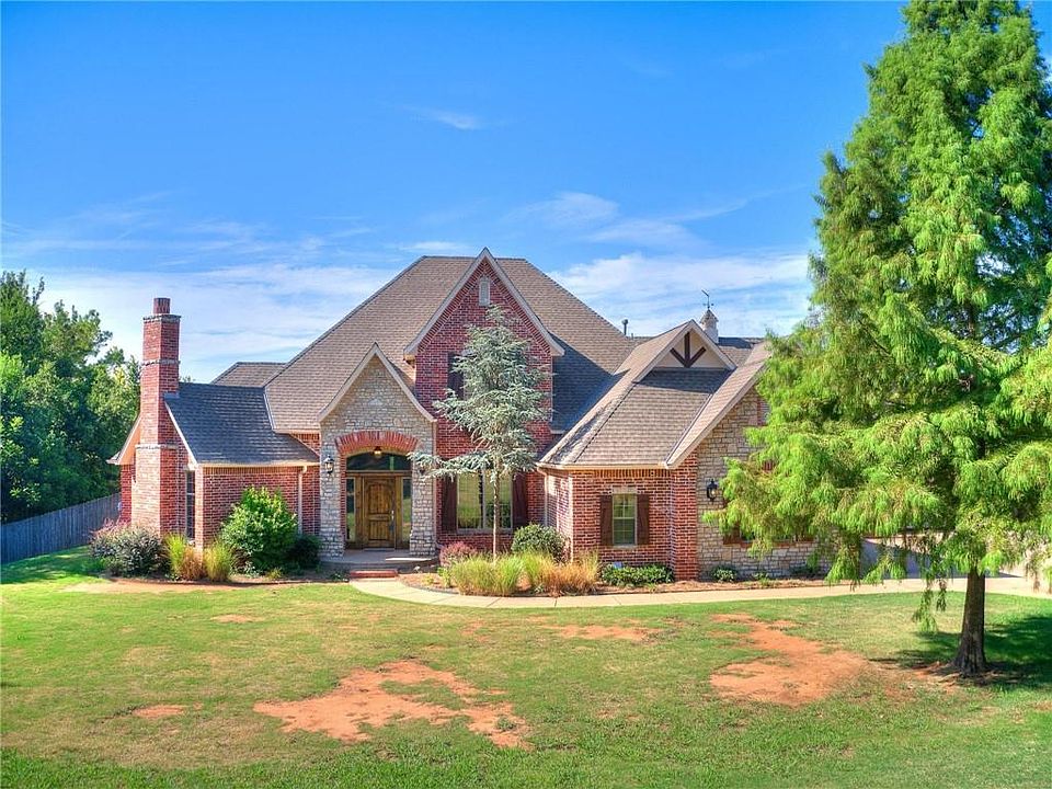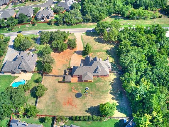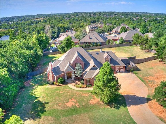 Beautiful Edmond home on a wooded 1.39 acres. The home offers a true 5 bedrooms with many upgrades: which include: storm shelter, smart home system-lights, garage and entry doors; security system with 3 google nest outdoor and door bell camera with facial recognition; new appliances-double oven with matching microwave, fridge and range top; 220v system in main garage; full property sprinkler system; remodeled powder bath, new paint: exterior, study and upstairs bedroom. Study has cathedral ceiling, bookcases, built-in desk and stone fireplace. Kitchen has large island, granite, pantry, new appliances and two Bosch dishwashers. Master bedroom with ensuite, with whirlpool tub, large shower, vanity, two sinks and walk in closet. Second bedroom downstairs with full bathroom and walk in closer. Three bedrooms upstairs all with walk in closets. Upstairs bathroom has two vanities, tub and separate shower. Access to Steeplechase community pool and park within walking distance!!